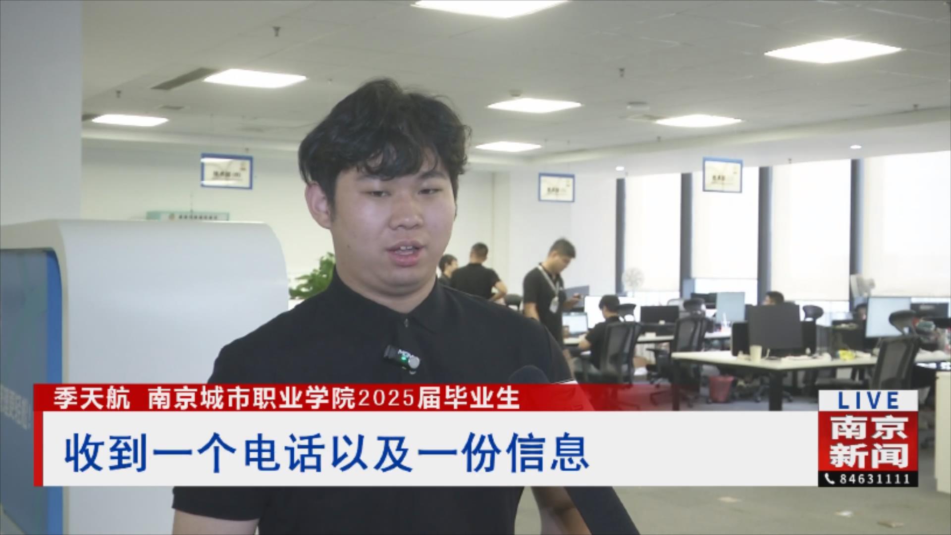 南京城市職業(yè)學(xué)院2025屆畢業(yè)生季天航說道:“8月份的時候,我收到一個電話、一條信息,告訴我江寧萬達有一場招聘會,然后我就去投了一份簡歷,最后成功入職了。因為我個人可能不太會去關(guān)注一些公眾號以及這類的信息,我覺得人社部門做這方面的推廣其實挺有用的。”