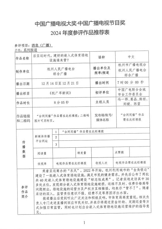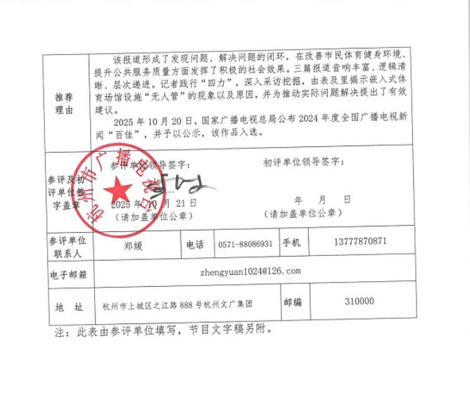 根據(jù)相關(guān)評(píng)獎(jiǎng)要求,我單位擬推薦杭州人民廣播電臺(tái)的廣播消息(系列報(bào)道)《后亞運(yùn)時(shí)代,建好的嵌入式體育場(chǎng)地設(shè)施誰來管?》和南京廣播電視臺(tái)的廣播專題《“零碳鄉(xiāng)村”不等于“窮村”!》參加第四屆中國廣播電視大獎(jiǎng)?中國廣播電視節(jié)目獎(jiǎng)(2024年度)復(fù)評(píng),現(xiàn)予公示。公示期:2025年10月22日至2025年10月28日。如有異議,請(qǐng)與委員會(huì)秘書處聯(lián)系。聯(lián)系電話:025-84561700、18652075407,聯(lián)系郵箱:cstgbxw@163.com。